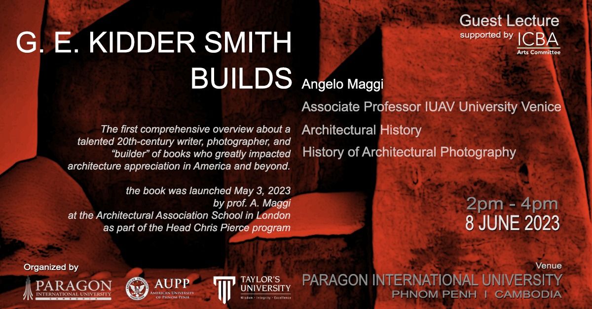 Contents: Dr. Angelo Maggi will present his latest book, "G. E. Kidder Smith Builds: The Travel of Architectural Photography" co-authored by S. P. Smith and G. E. Kidder. This groundbreaking publication sheds light on the life and works of a distinguished 20th-century writer, photographer, and "builder" of books. The book's launch, which took place at the Architectural Association School in London, has received widespread acclaim for its significant contributions to architecture appreciation.