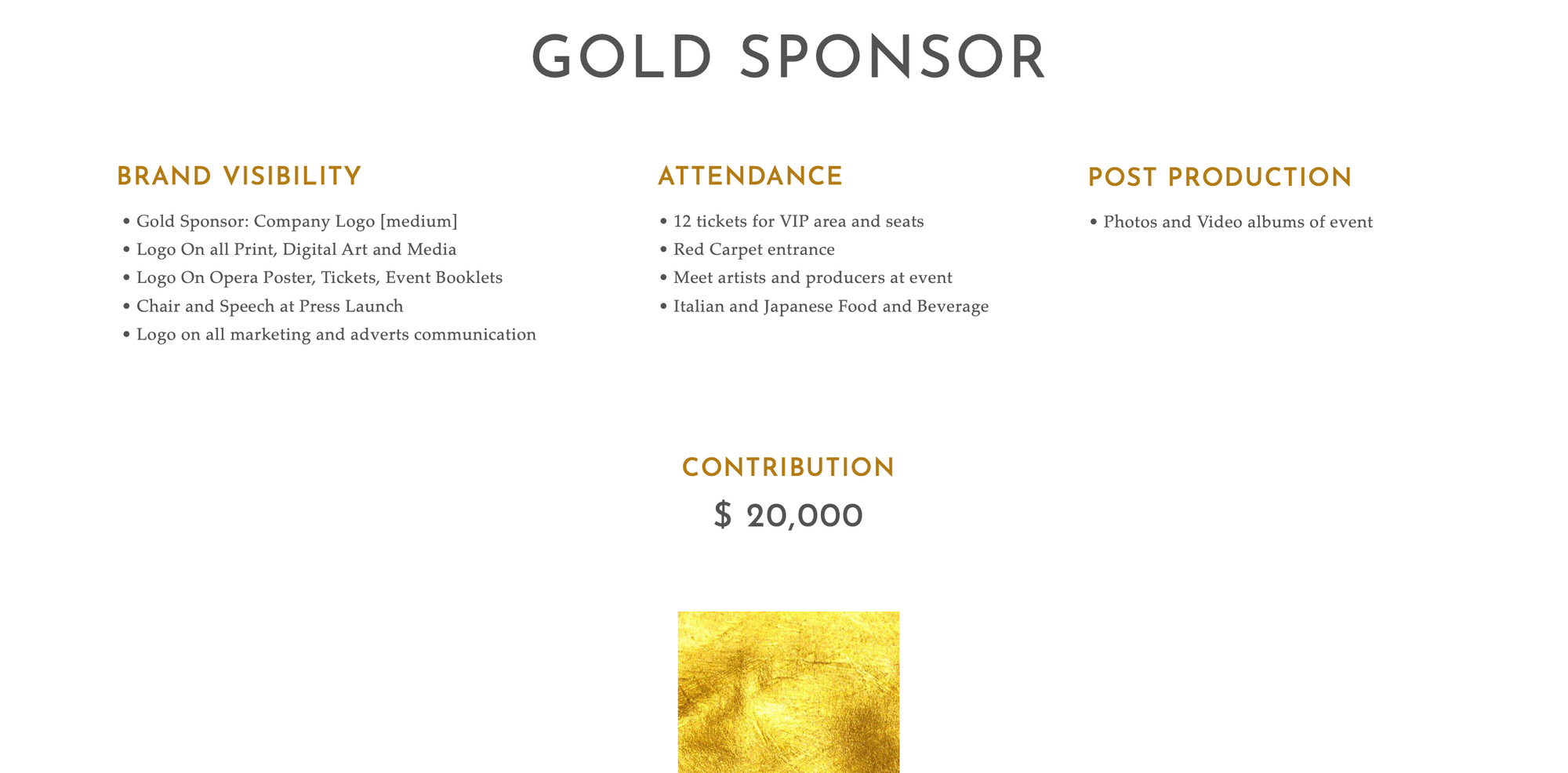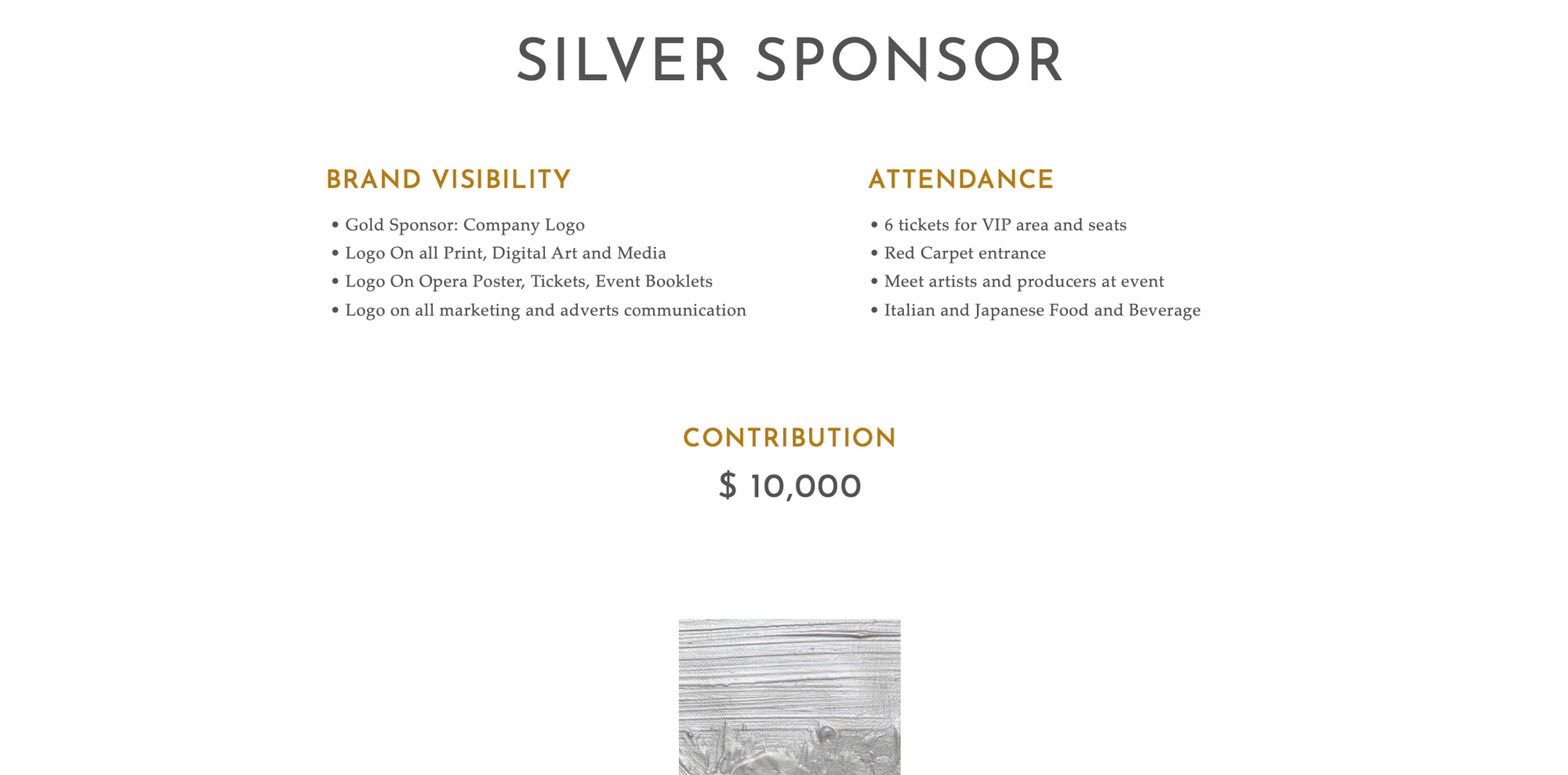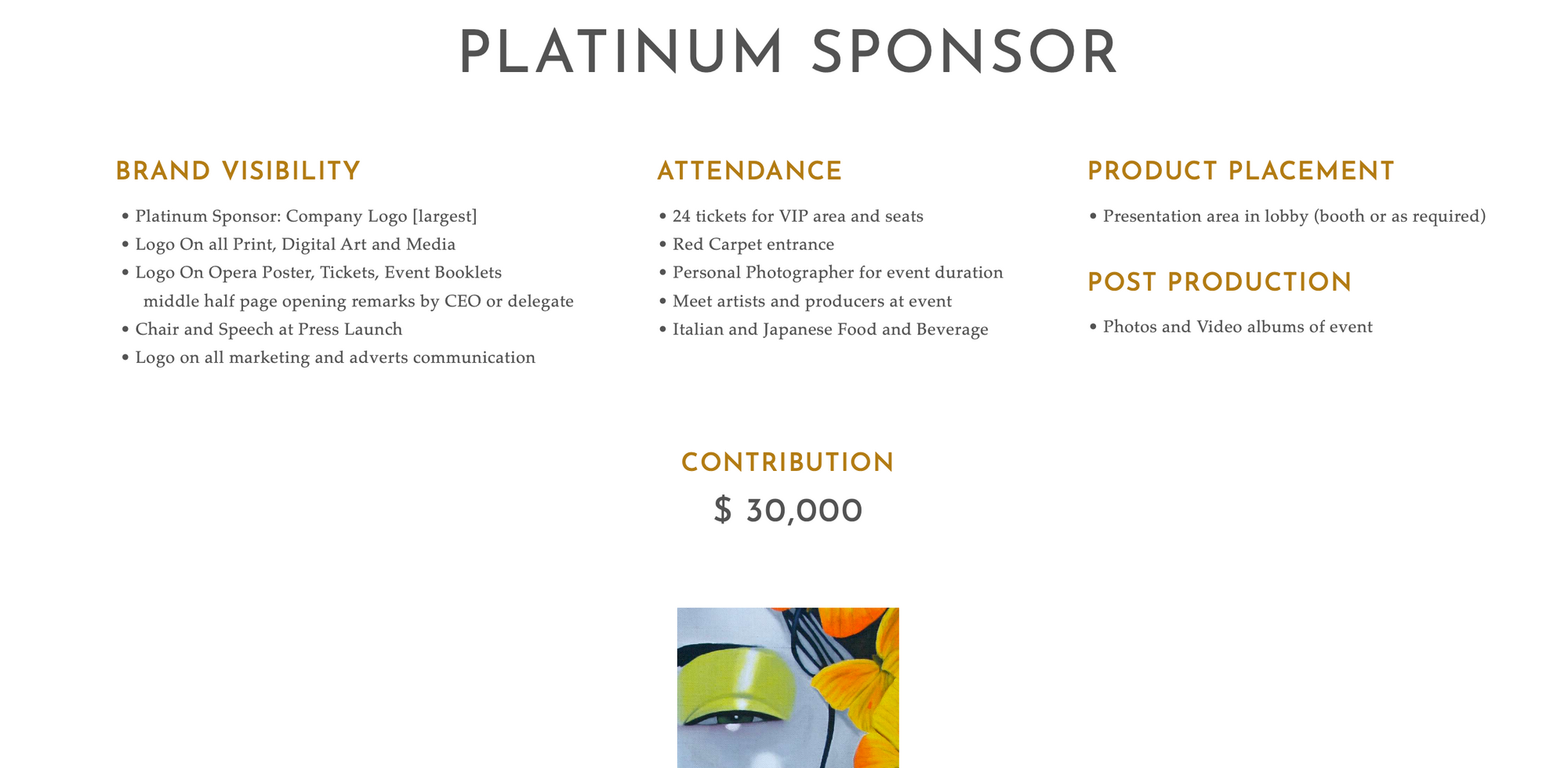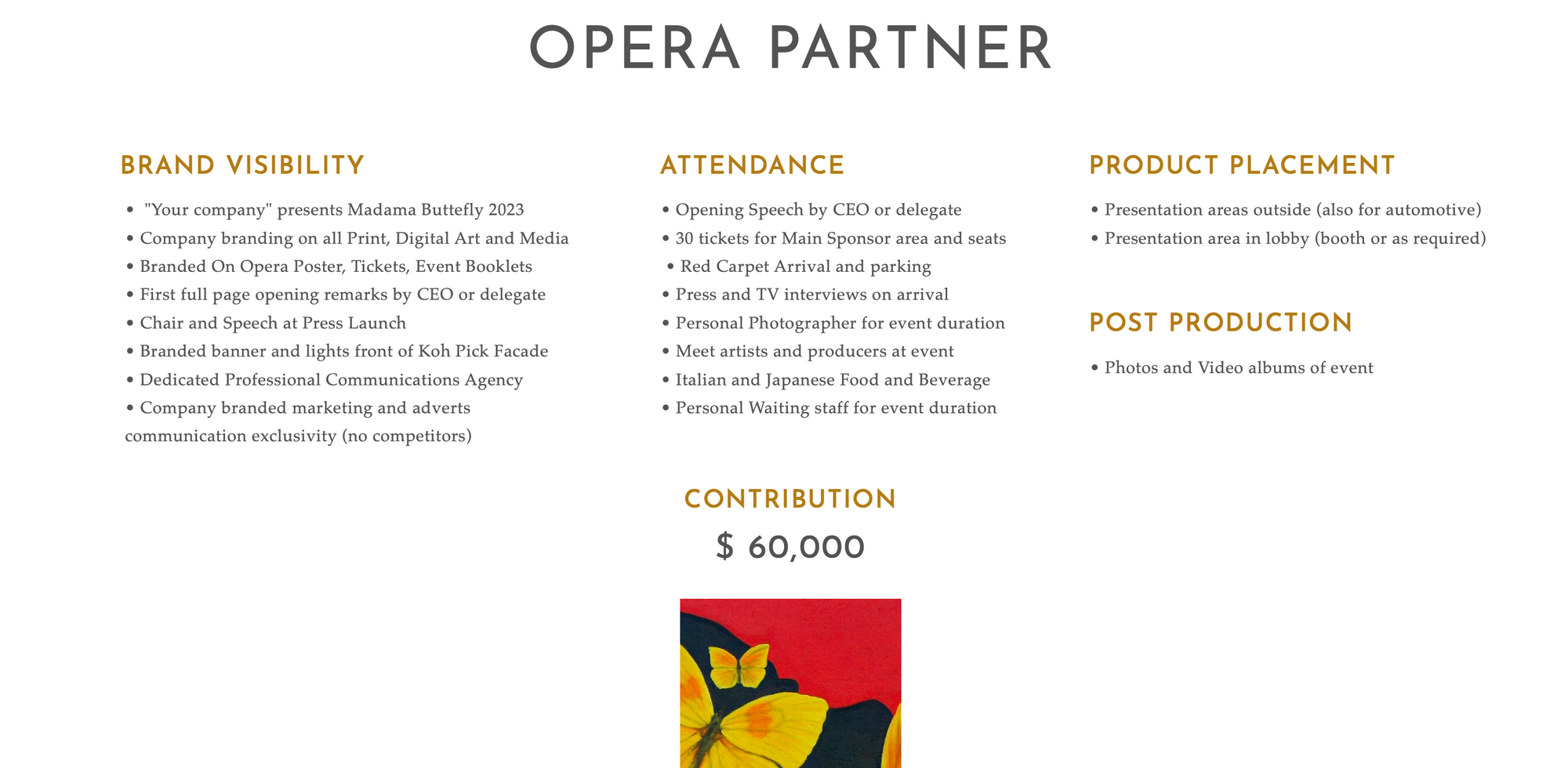 This is a rare opportunity to showcase your support for the arts in Cambodia, as a corporation, company, or as individual lover of the arts. Operas are some of the most complex classical events to produce, because of the many technical challenges. Requirements for Madama Butterfly include a full Orchestra, a Choir, 16 cast members, 15 art/ production staff, multiple suppliers and vendors, costumes, stage design and props, lighting design, and 2 weeks of rehearsals. Most of the cast and production staff are flown in from Italy, Japan and overseas. We have an amazing team wit great expertise, but we need your help to stage this amazing production. This is a project out of love and passion for Opera, the arts, and for development of classical productions in Cambodia. We are now looking for private and corporate partners who share our vision in turning this exceptional event into a roaring success.