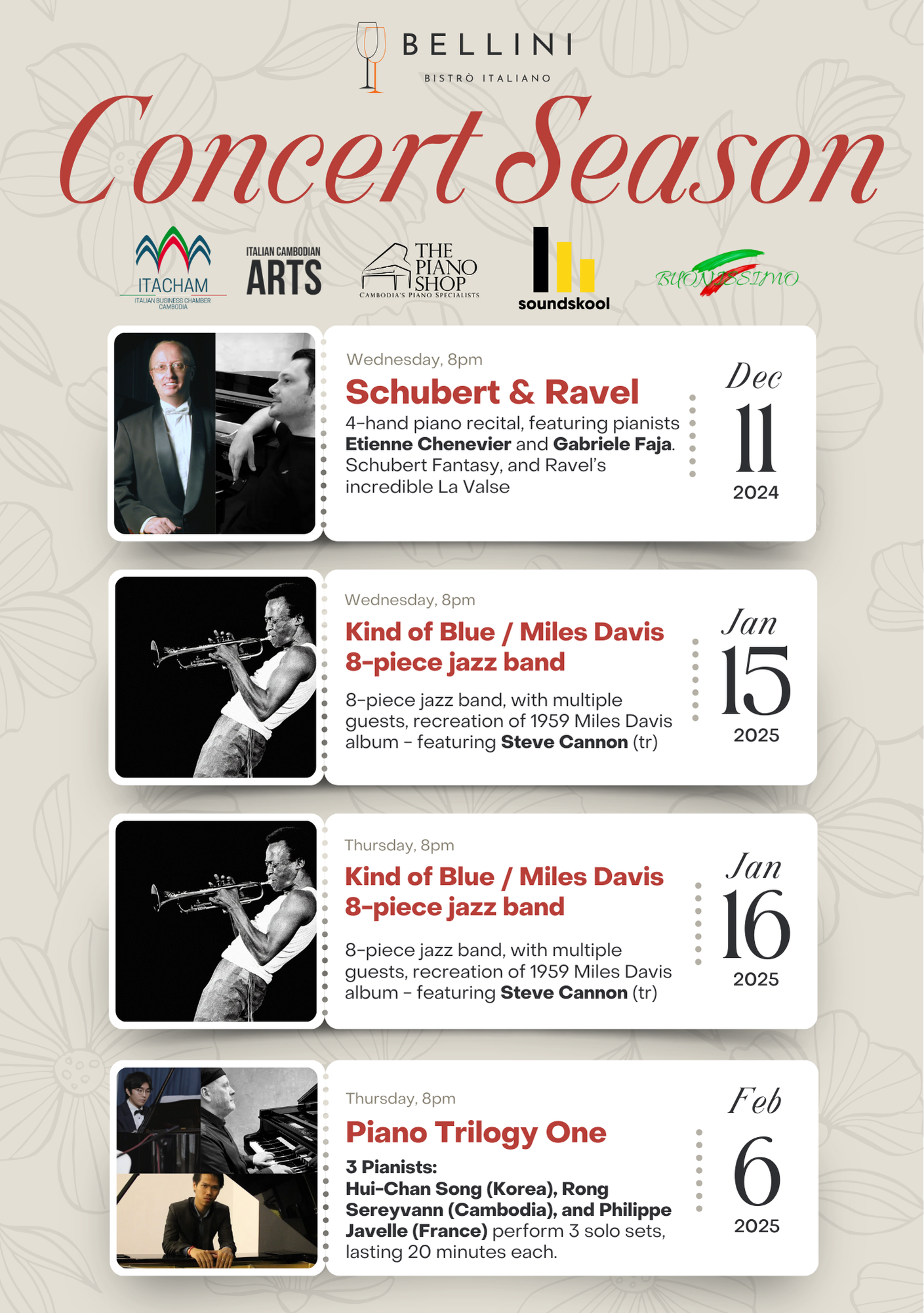 Bellini Phnom Penh, the open air Italian Bistrò in Phnom Penh, resumes its musical activities on December 11th, 2024. Bellini presents 8 concerts with more than 30 artists, from Classical to Jazz.