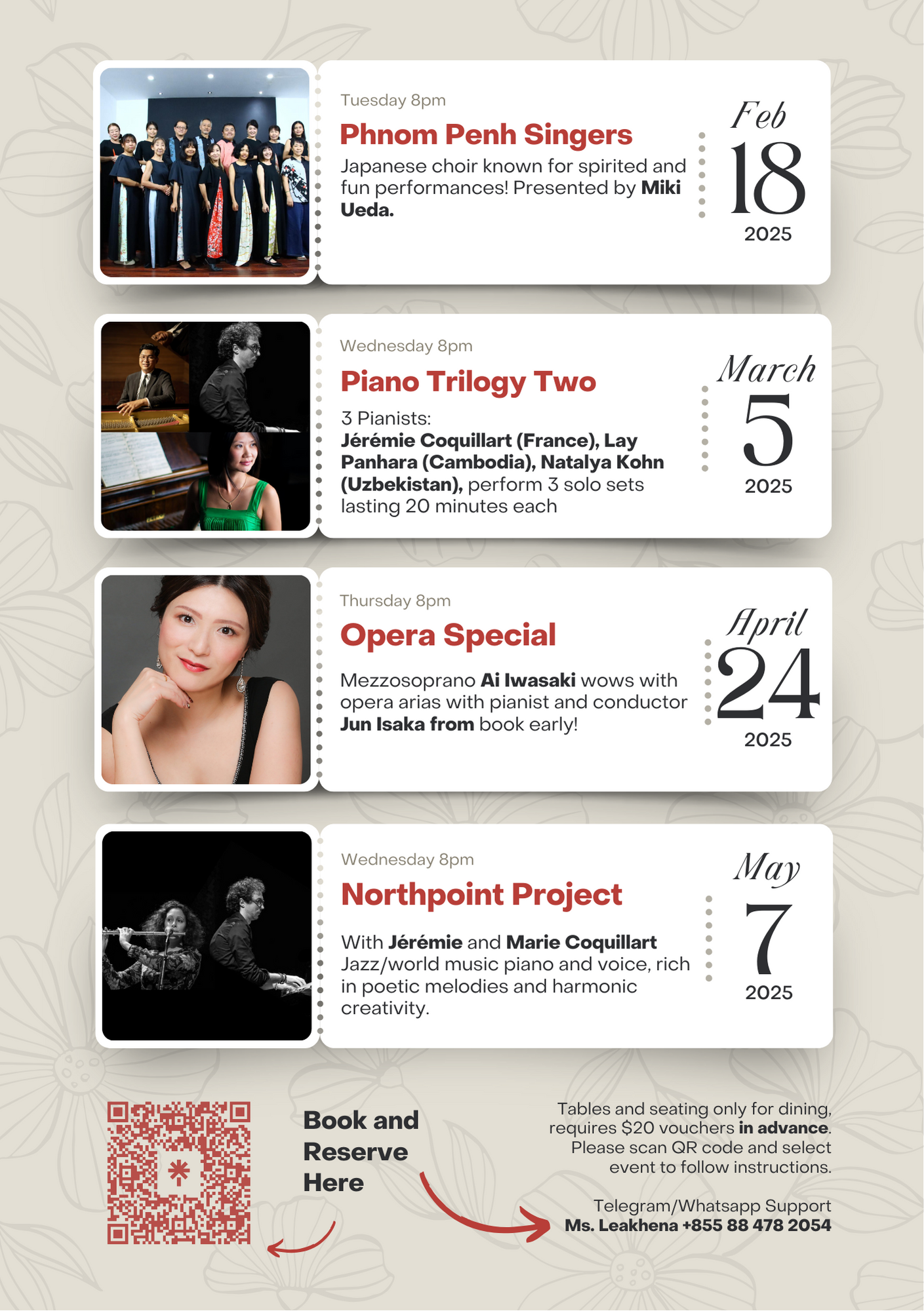 The Bellini Concert Season is free, but a deposit of $20 is required when booking dining tables https://linktr.ee/bellinicambodia